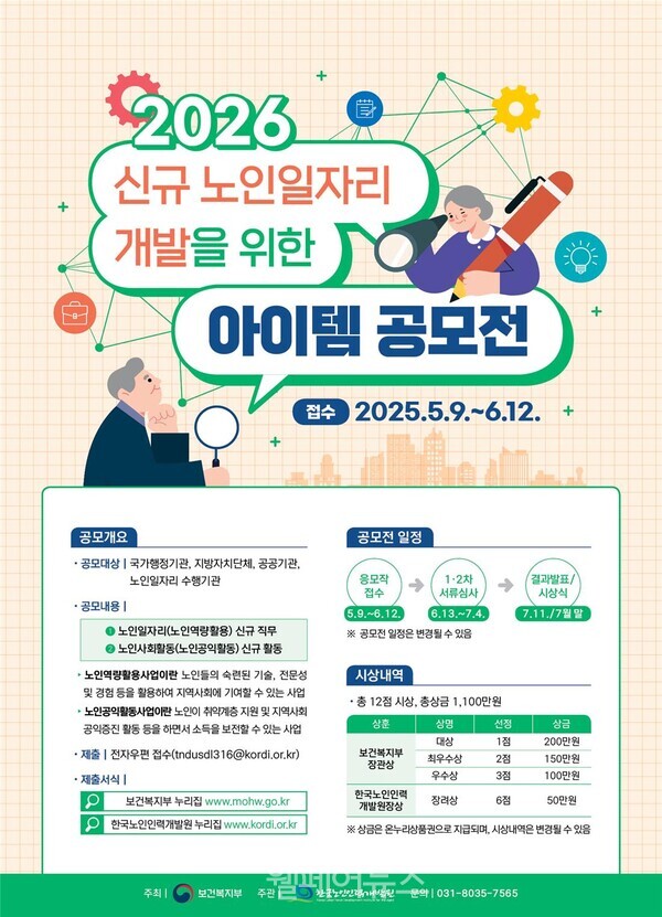 장애인신문·웰페어뉴스=박성용 기자 | 보건복지부는 오는 9일~다음달 12일까지 ‘2026년 신규 노인일자리 개발을 위한 아이템 공모전’을 국가행정기관, 지방자치단체, 공공기관, 노인일자리 수행기관을 대상으로 개최한다.